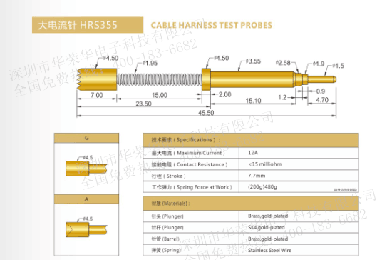 為了確保大電流的安全傳輸,大電流探針的針頭分為兩段。行程移動期間。兩段針頭在徑方向彼此分開。因此,針頭段壓在針管上,降低轉移電阻。通過該原理,在較少發熱的同時傳輸較高的電流。大電流針額定電流有20A-100A.常用的電流針有: