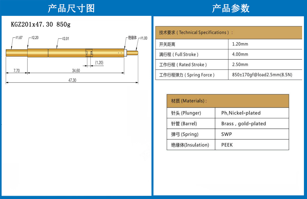 產品簡介:KGZ201探針,2.01mm測試針、總長47.30mm、彈簧針、測試針
